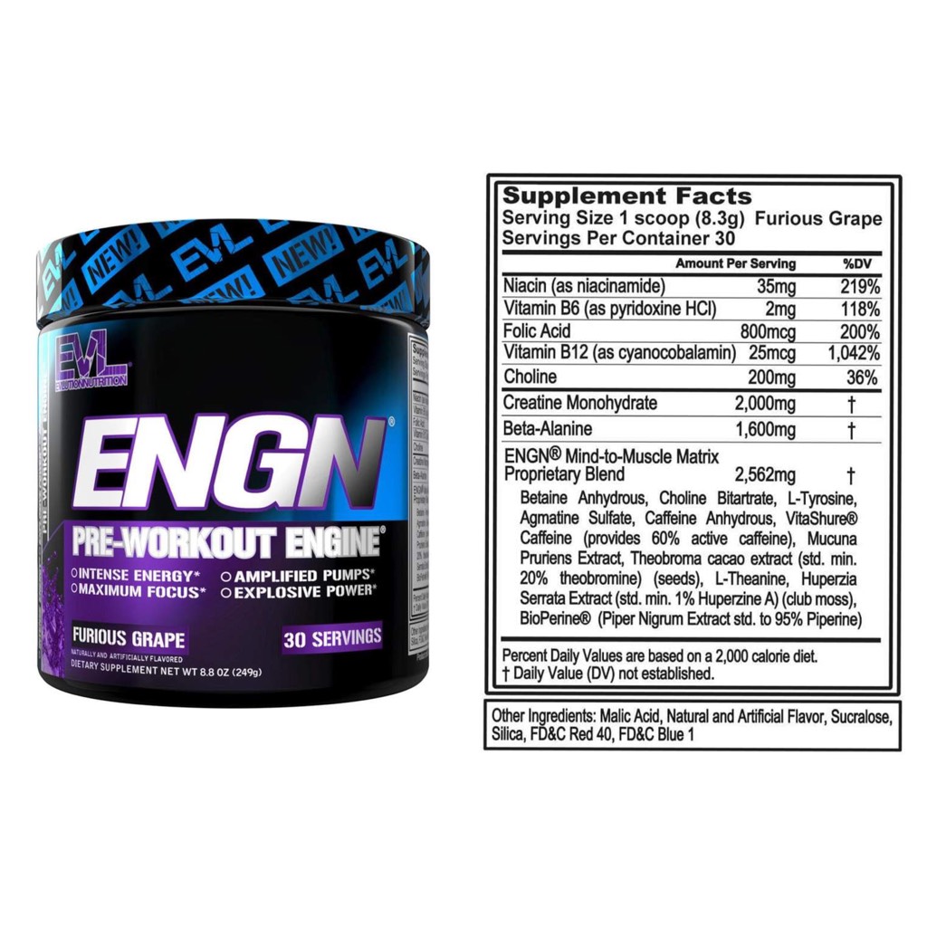 - Để đạt được tiềm năng tối đa, bạn cần năng lượng tối ưu và sự tập trung tinh thần để đạt được mục tiêu của mình. Công thức tiên tiến của ENGN được thiết kế để trở thành loại nhiên liệu hoàn chỉnh nhất trước khi tập luyện giúp thúc đẩy tâm trí của bạn đến kết nối cơ bắp cùng với năng lượng, sức mạnh, máy bơm và hiệu suất của bạn. Ngoài ra, nó được pha chế để tránh va chạm với các bài tập trước khác trong một công thức sạch không đường, không carbs và không calo. Không bao giờ ổn định, hãy phát triển với ENGN để thúc đẩy kết quả của bạn !