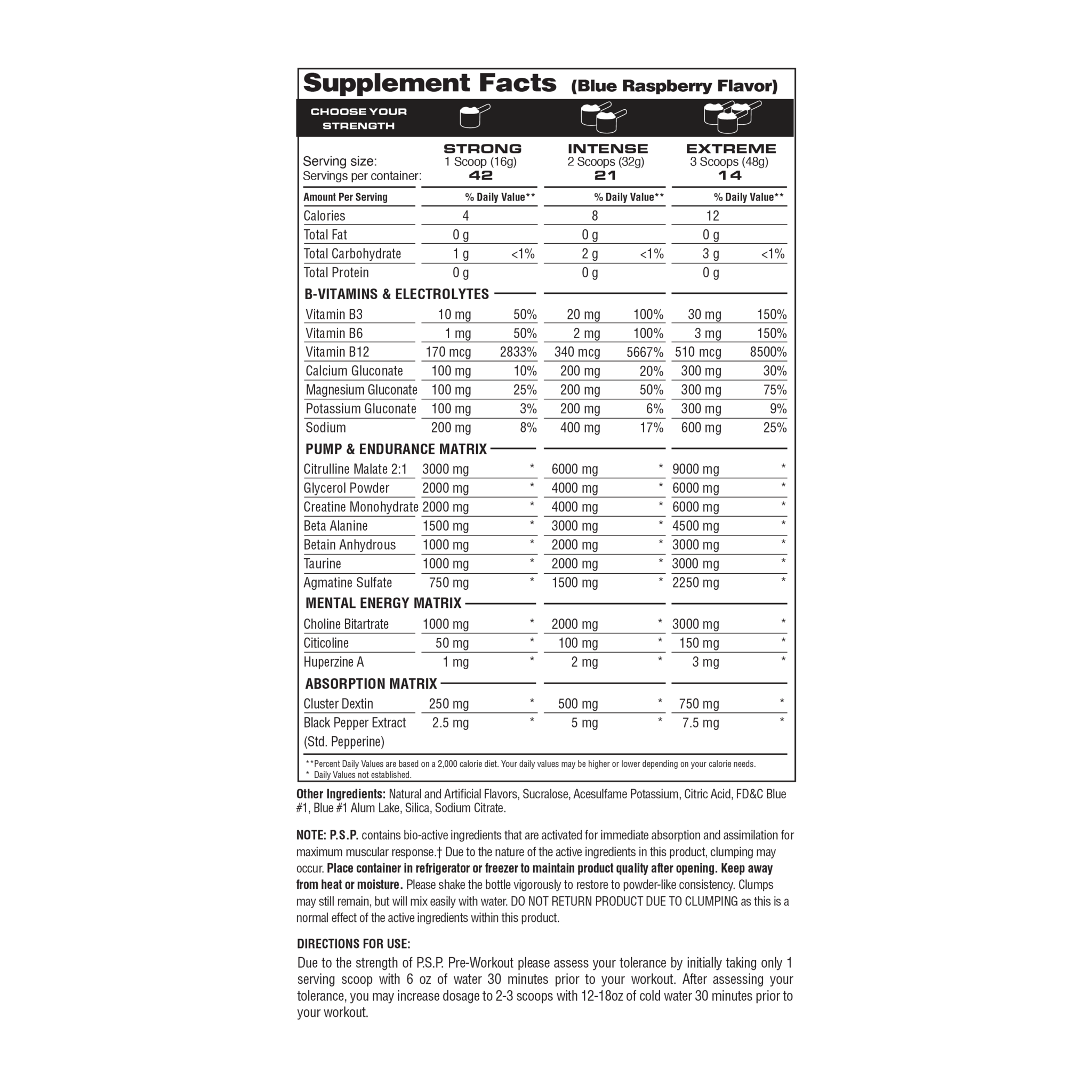 - Do sức mạnh của P.S.P. Trước khi tập luyện, vui lòng đánh giá khả năng chịu đựng của bạn bằng cách ban đầu chỉ lấy 1 muỗng phục vụ cấp độ với 150 ml nước 10 - 15 phút trước khi tập luyện. Đánh giá khả năng chịu đựng của bạn trước khi tăng liều lượng. Không vượt quá 3 muỗng trong khoảng thời gian 24 giờ .