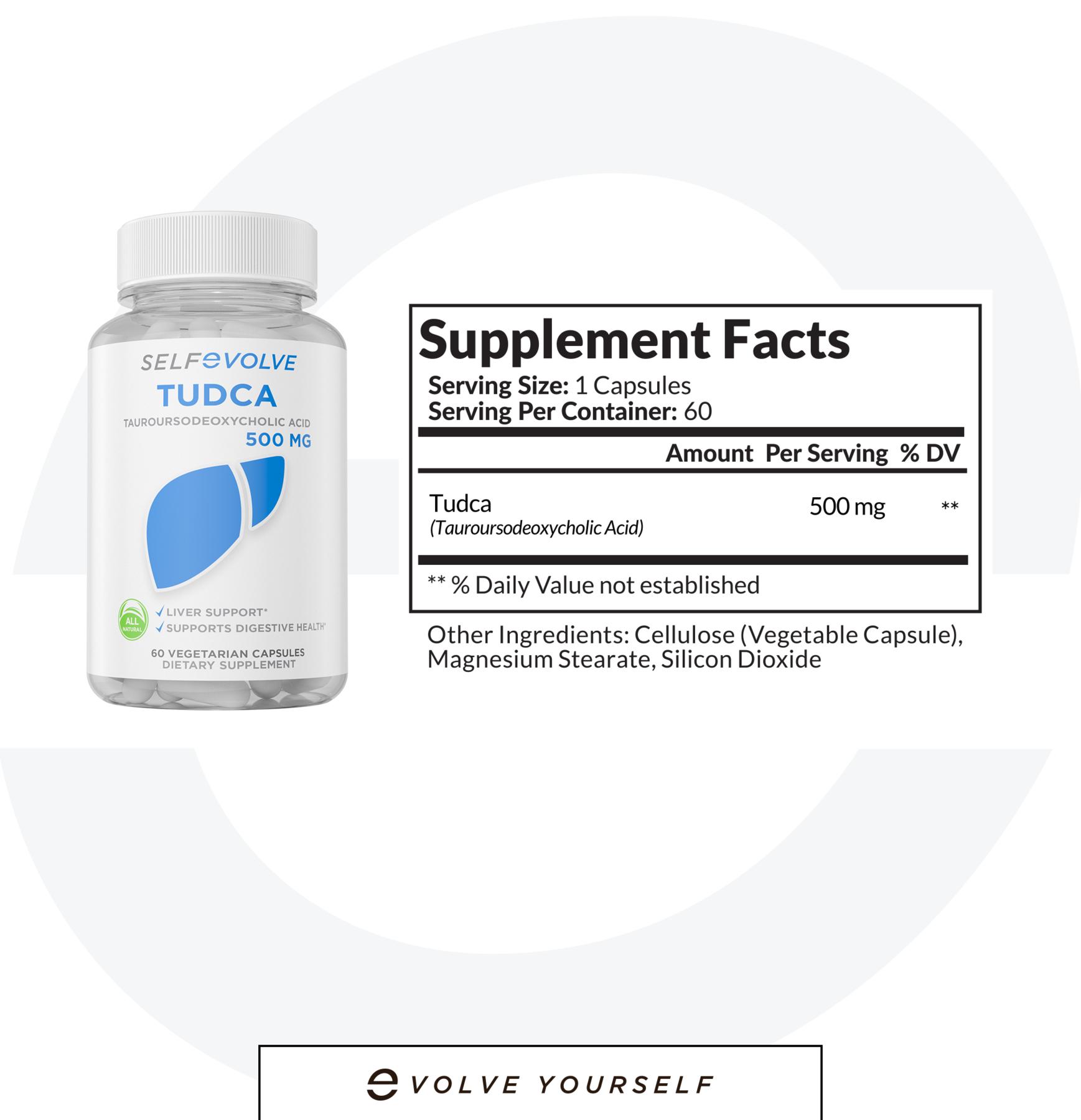 - Hầu hết các sản phẩm TUDCA chỉ có 250mg mỗi viên nang, do đó rất tốn kém để mua đúng liều lượng Selfevolve TUDCA có đầy đủ 500mg cho mỗi viên nang rau, vì vậy bạn có thể trải nghiệm toàn bộ lợi ích của TUDCA.